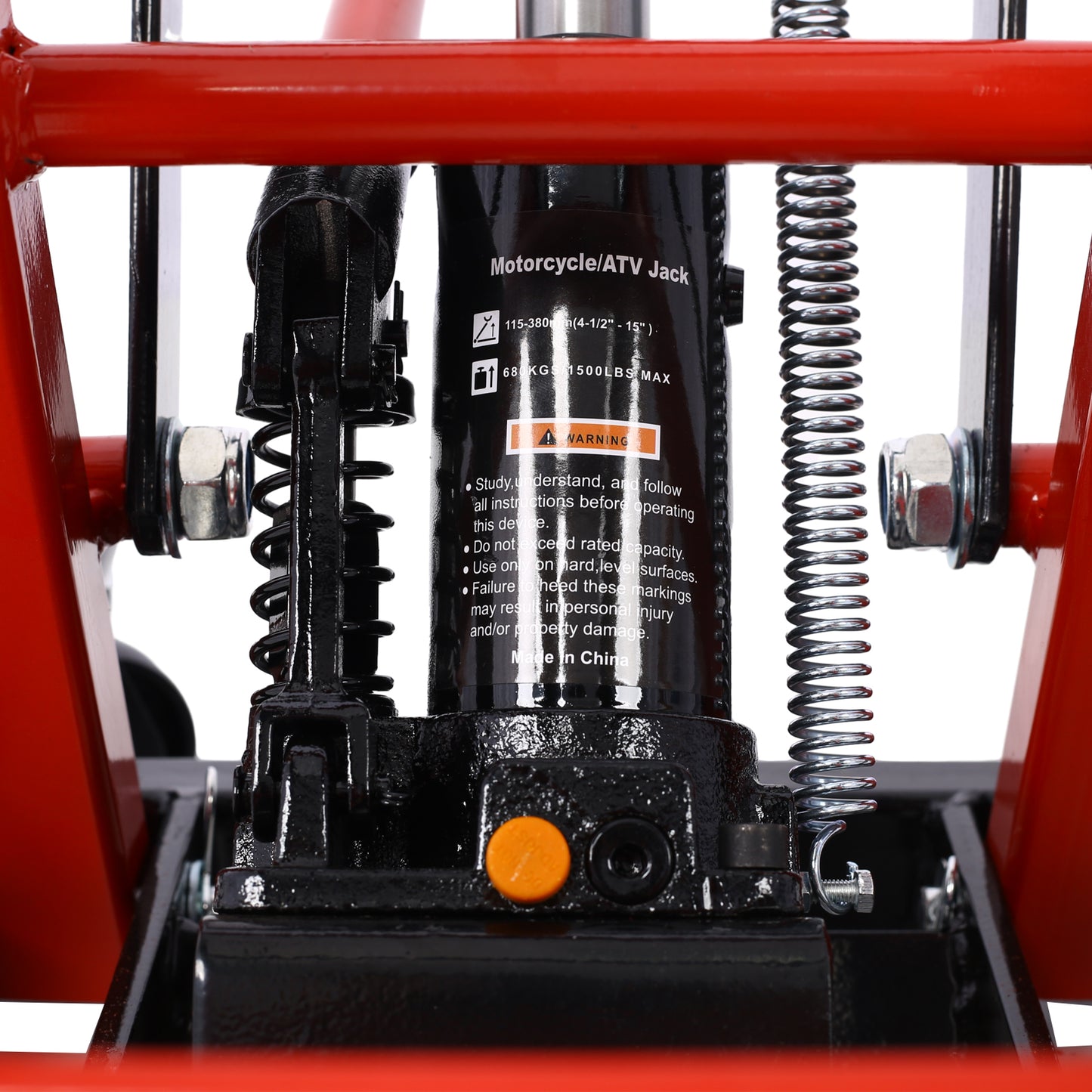 Superior Weight-bearing Capacity: Elevate your motorcycle maintenance game with our hydraulic motorcycle lift jack. Tested and proven to securely hold up to 1500 lbs/0.7 tons, this jack is a reliable ally for lifting various motorcycles including standard bikes, touring bikes, cruisers, ATVs, and more in your garage.