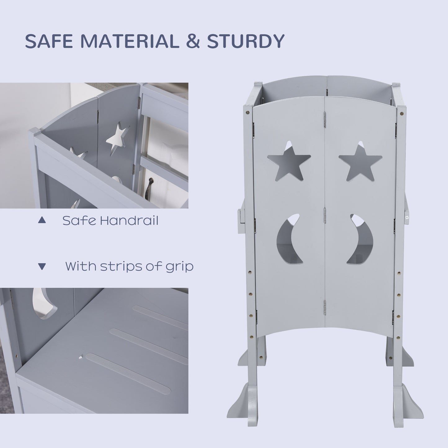 Wooden Kitchen Step Stool for Kids, Foldable Toddler Tower, Helper Stool for Kitchen Counter with Support Handles Safety Rail, Gray