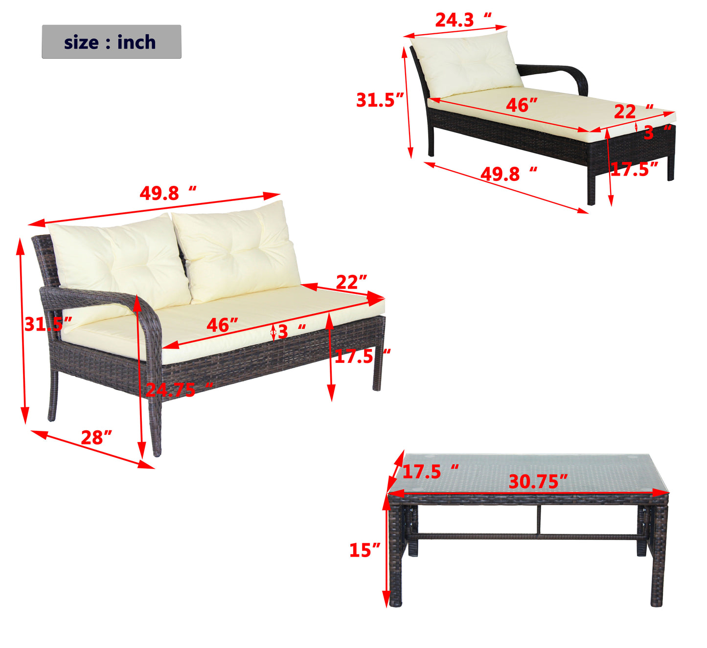 - Two Seater Sofa: 49.8x 28x 31.5 inch (L X W X H);Lounger Sofa : 49.8x 24.3 x 31.5inch (L X W X H); Coffee Table:30.75x 17.5x 15inch (L X W X H)