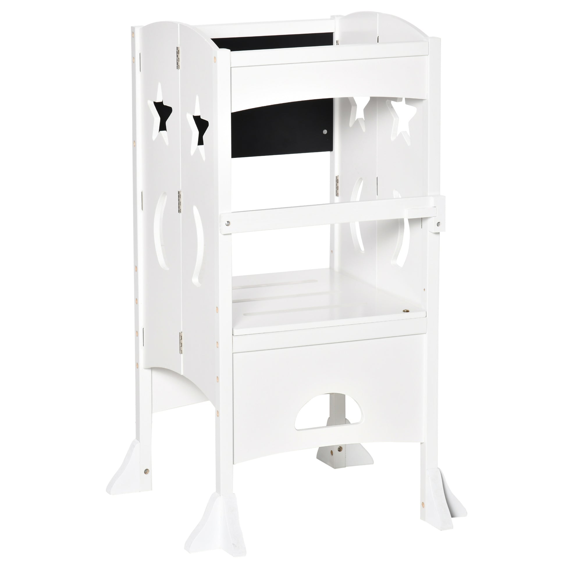 2 in 1 Kids Foldable Kitchen Step Stool, Toddler Standing Tower with Chalkboard and Lockable Handrail for Children 3-6 Years Old, White
