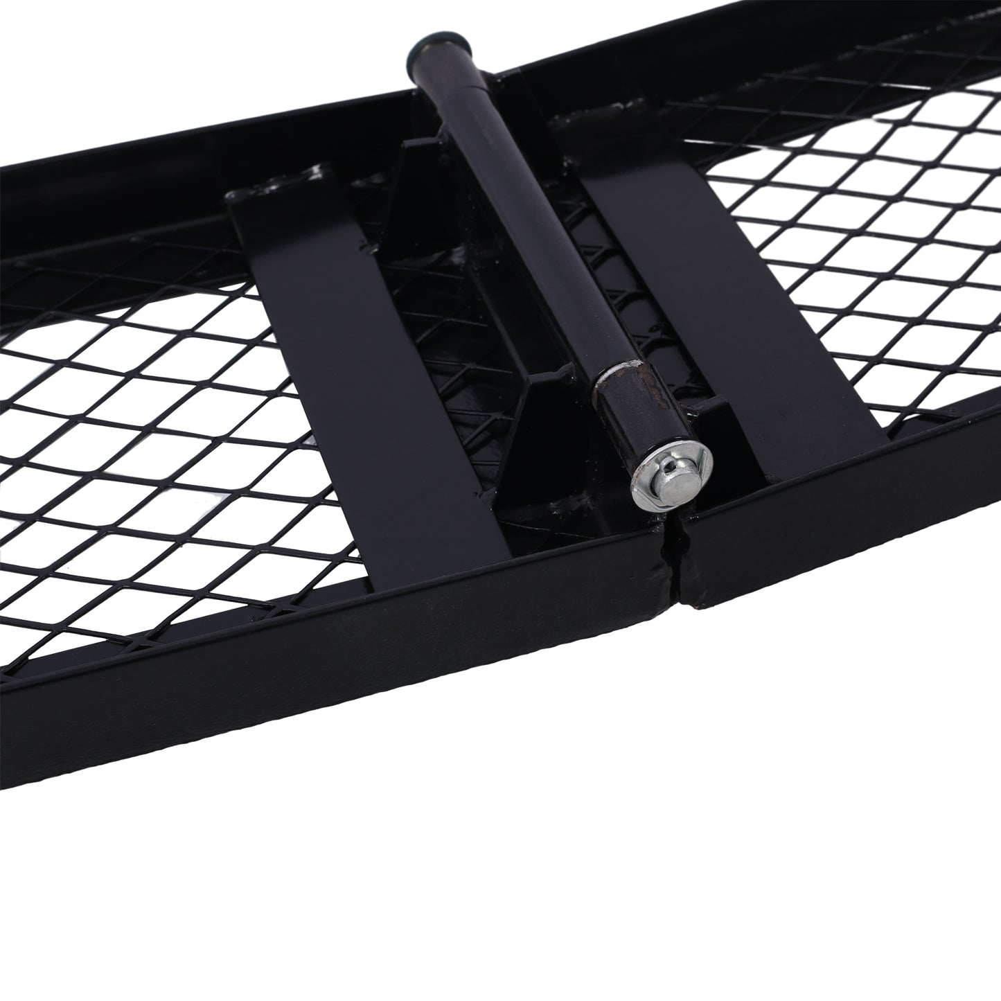 - Enhanced Functional Design: Featuring sturdy hinges that allow for convenient folding and storage without occupying excessive space, our foldable ramp is designed for optimal functionality. Its resilience to adverse weather conditions and easy-clean properties make it a versatile and low-maintenance option. The mesh surface provides reliable traction and prevents debris accumulation, while the extended tailboard facilitates easy equipment loading.