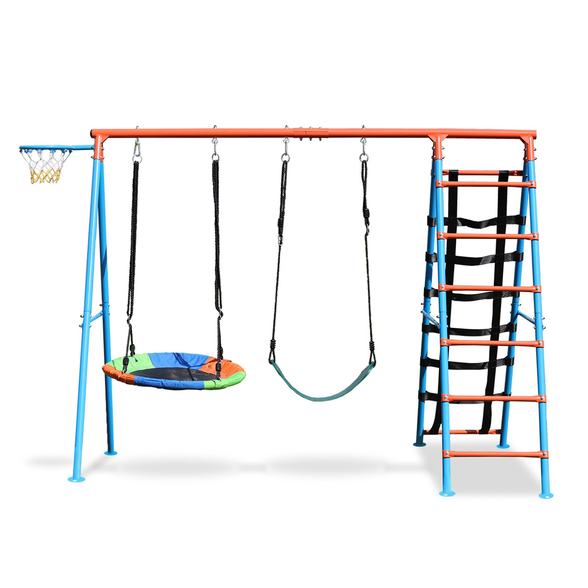 - Versatile 4-in-1 Fun: With a saucer swing, belt swing, basketball hoop, and a climbing ladder with nets, this swing set offers endless excitement. Your kids can share the fun with friends and create lasting memories.