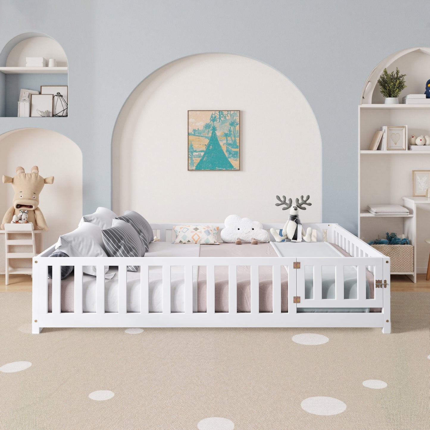 Full Size Floor Platform Bed with Fence and Door for Kids, Montessori Floor Bed Frame with Support Slats for Toddlers, Wooden Floor Bed White