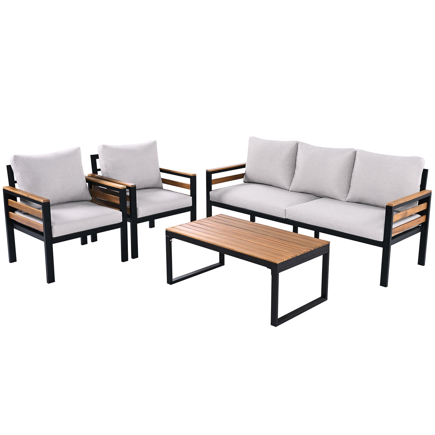 - Stylish Acacia Wood Accents: This set includes a beautifully crafted coffee table featuring acacia wood armrests and a sturdy acacia wood top. The rich, natural wood finish adds a touch of elegance while ensuring durability and long-lasting use for your outdoor space.