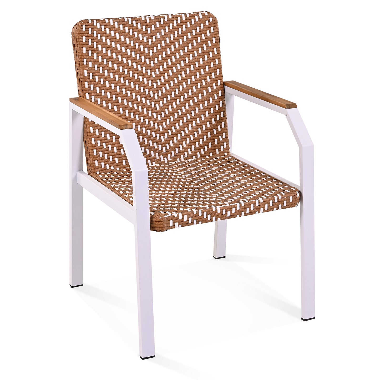 - Durable Rattan Chairs: This set includes 6 ergonomic dining chairs made of brown and white PE rattan, which can resist UV rays, fading and wear and tear in all seasons. Acacia wood armrests and sturdy iron legs add to their durability and style.
