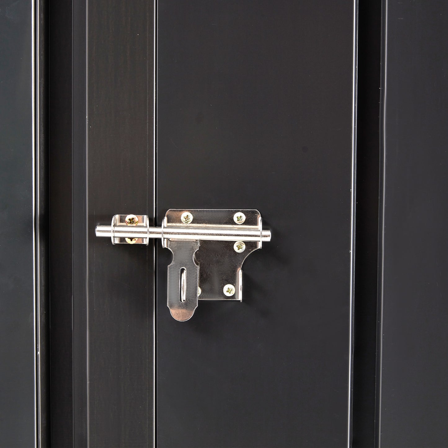 - DURABLE AND WEATHER-RESISTANT: Our outdoor storage tool shed is designed with a sloping roof for quick drainage, effectively preventing rainwater from accumulating and causing rust. Made with UV and moisture-resistant materials, this storage shed offers a protected and safe environment for your valuable tools and equipment. Its sleek black tones and clean lines seamlessly blend into any yard or patio, adding an attractive architectural element to your outdoor space.