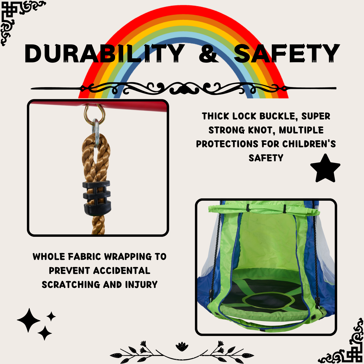 Safety and convenience are top priorities in our designs. This product is fully disassembled for easy storage and transportation. The four ground legs are equipped with ground spikes for a secure hold, ensuring stability while playing. Parents can rest easy knowing their children are safe while exploring, climbing and swinging.